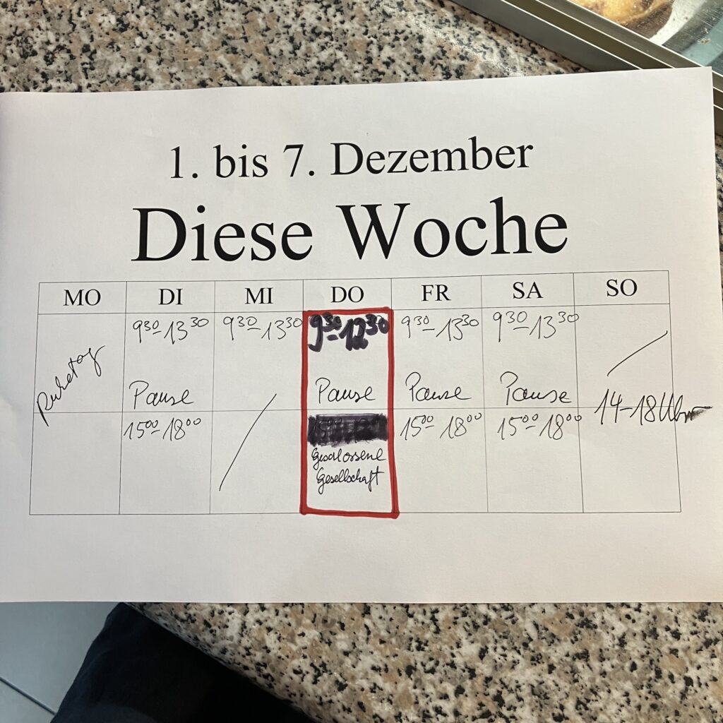 Dienstag, Donnerstag, Freitag und Samstag 15:00 – 18:00 Uhr